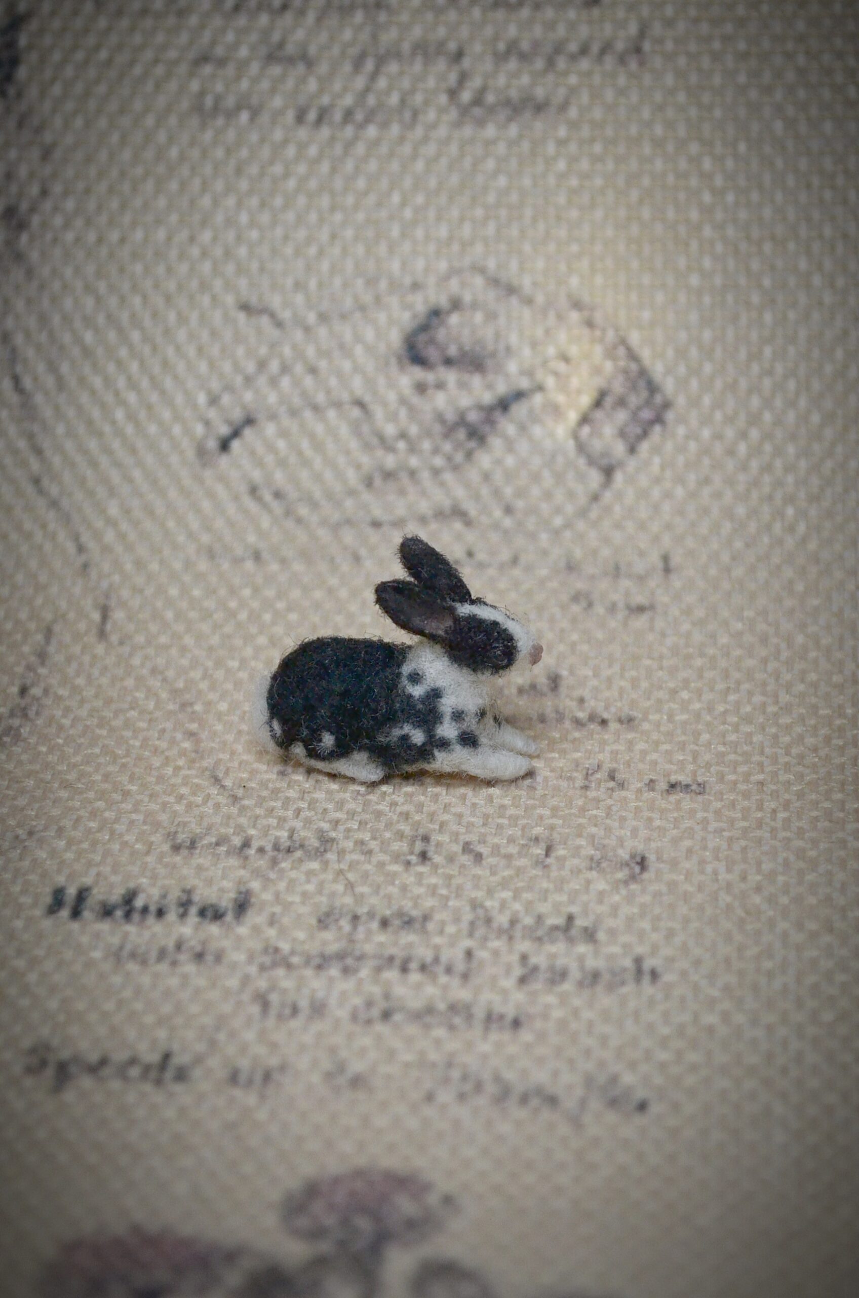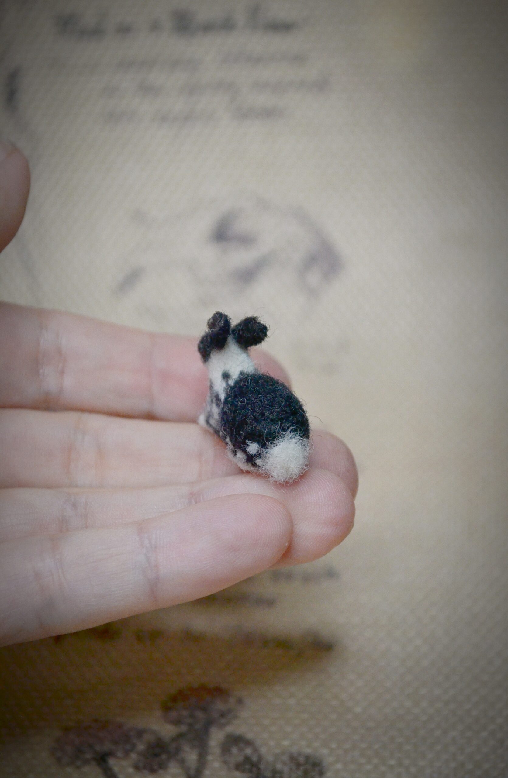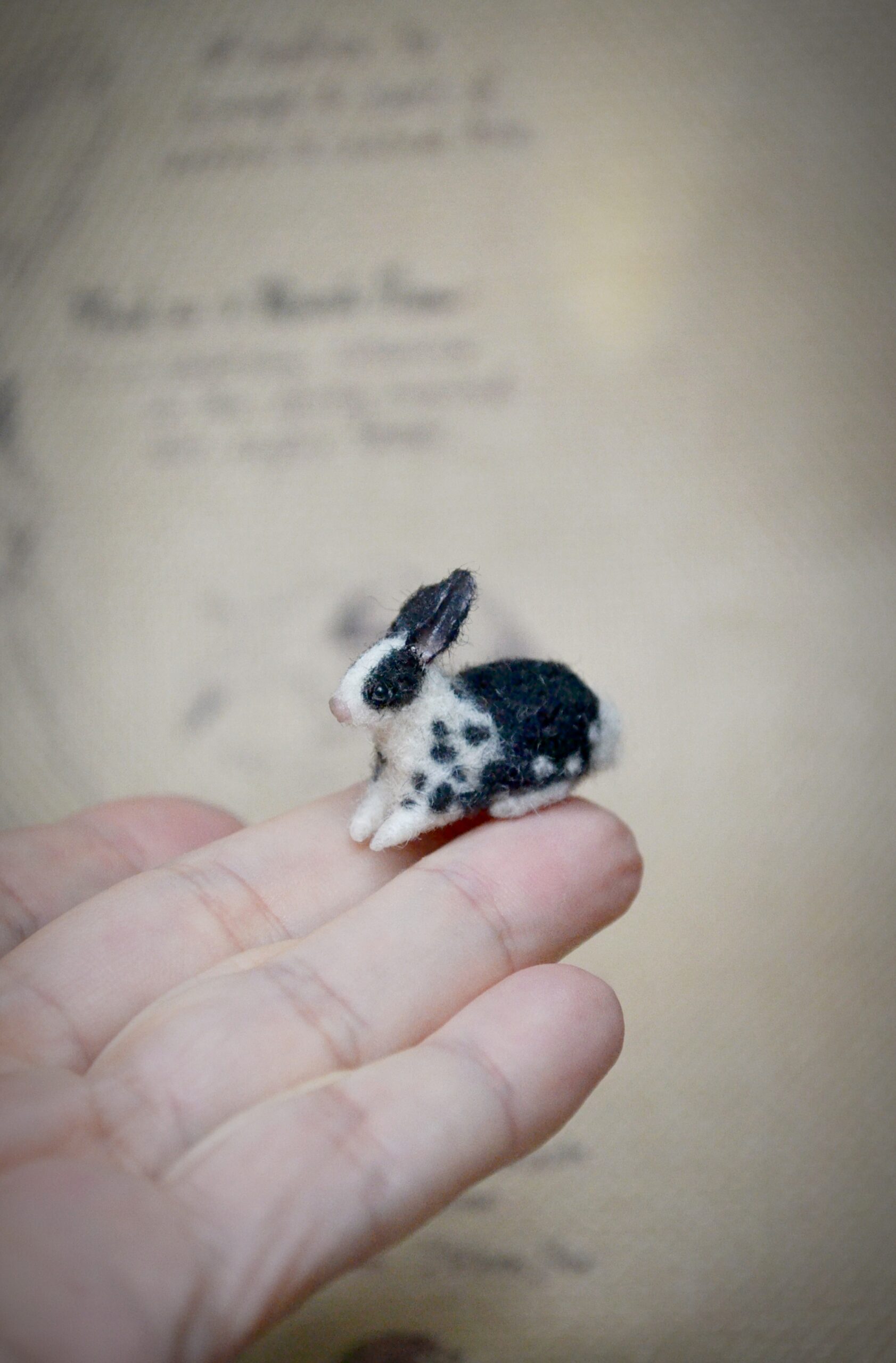 This handmade custom needle felted black and white rabbit miniature is a personalized wool pet portrait created from your photo. Carefully crafted from 100% natural wool, this tiny felted bunny captures the unique markings, colors, and character of your beloved pet in a delicate miniature form.
