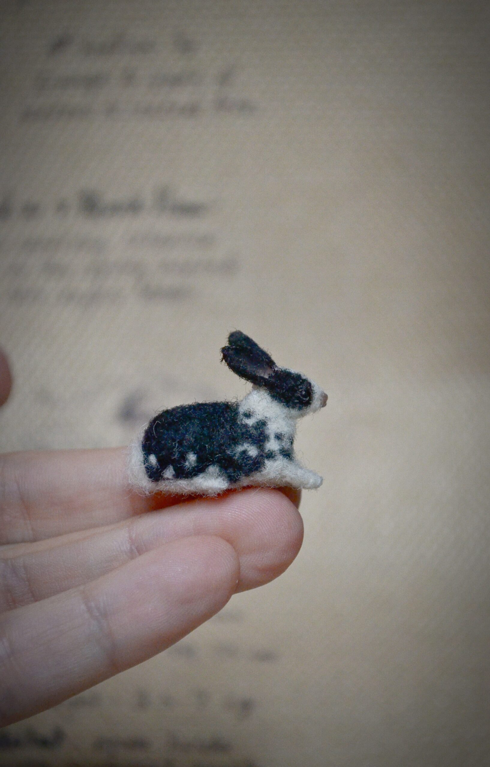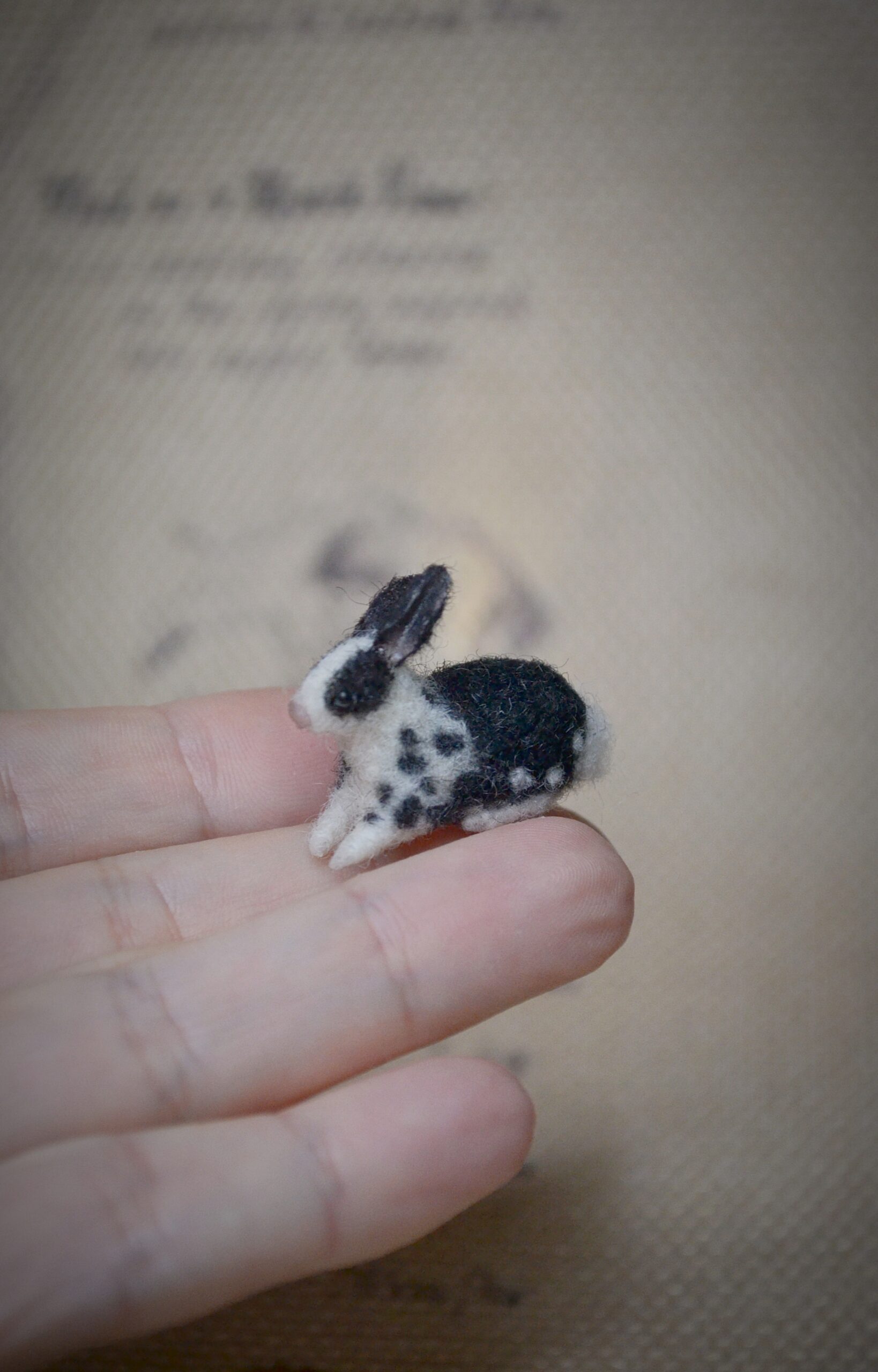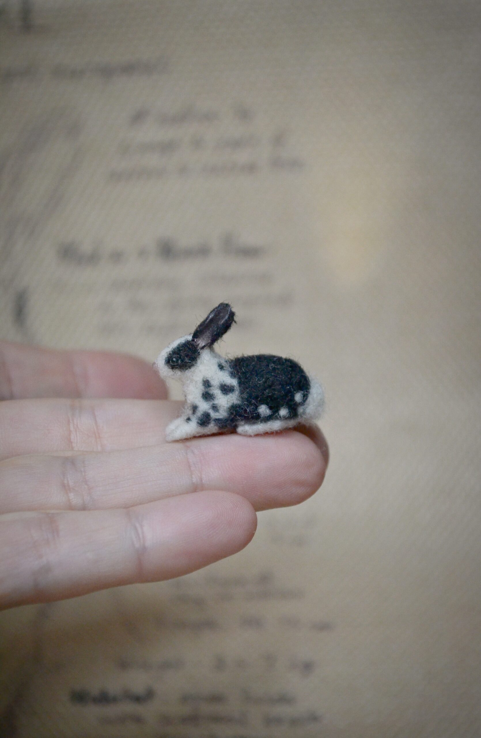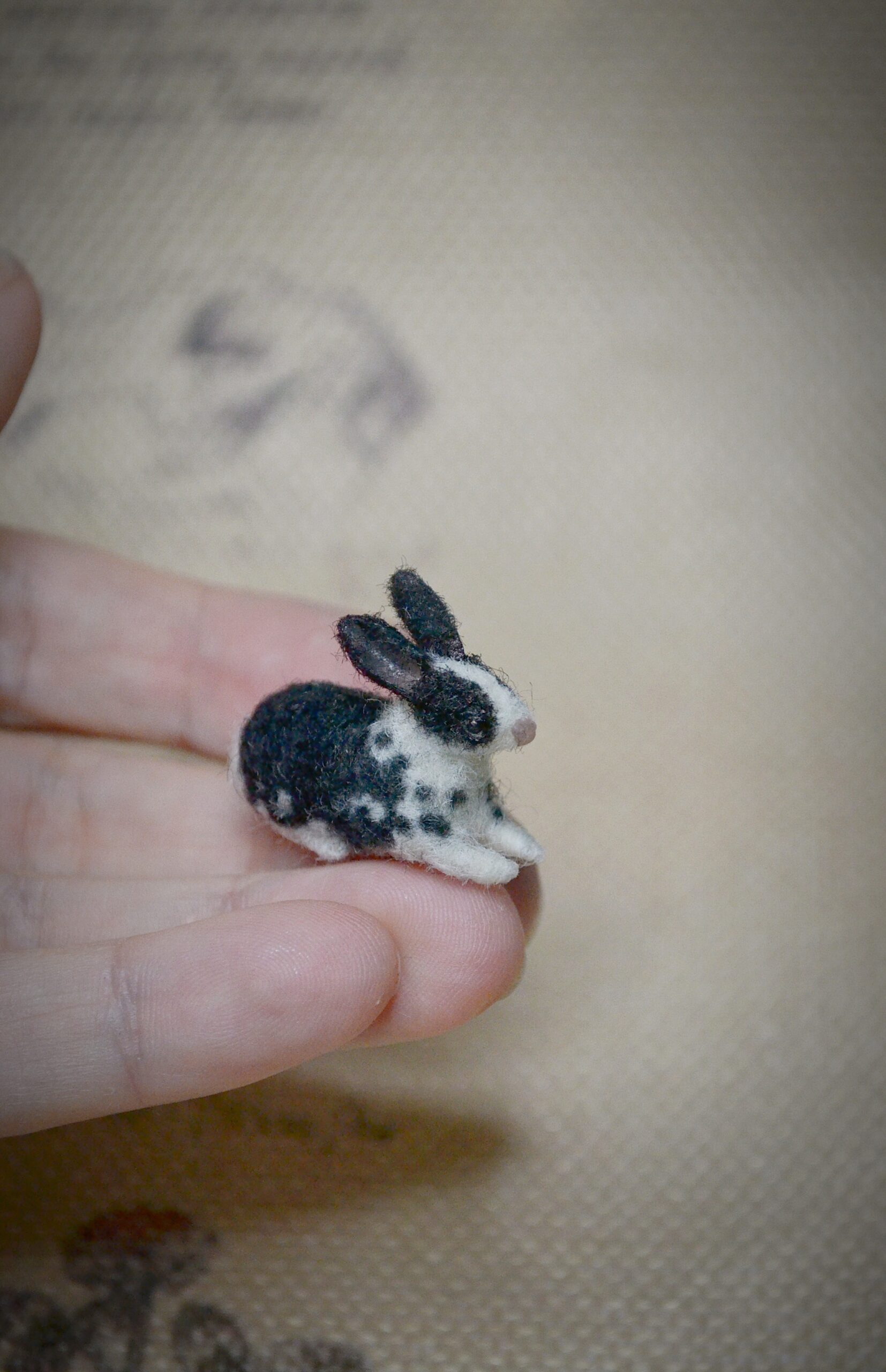 This handmade custom needle felted black and white rabbit miniature is a personalized wool pet portrait created from your photo. Carefully crafted from 100% natural wool, this tiny felted bunny captures the unique markings, colors, and character of your beloved pet in a delicate miniature form.