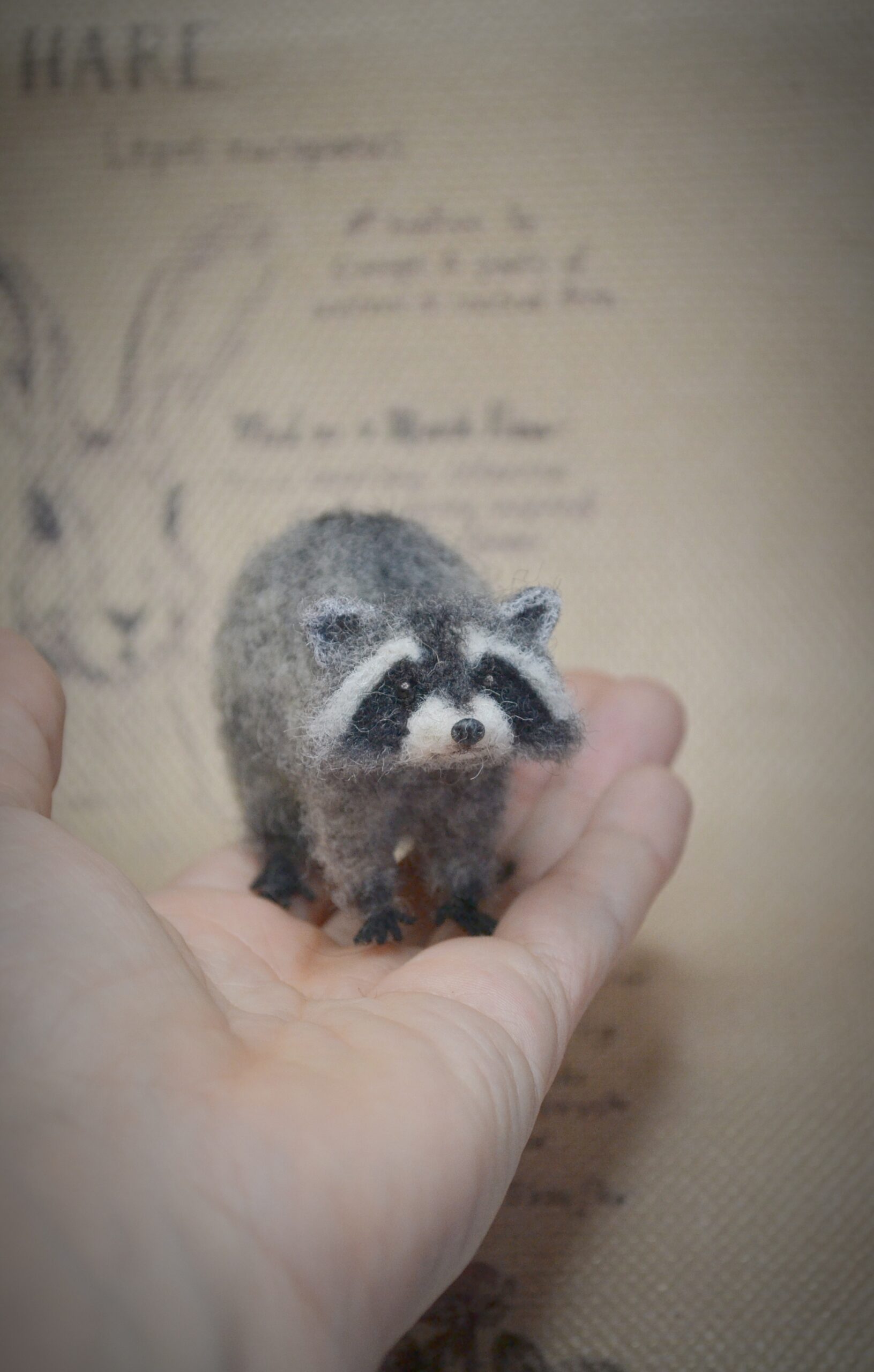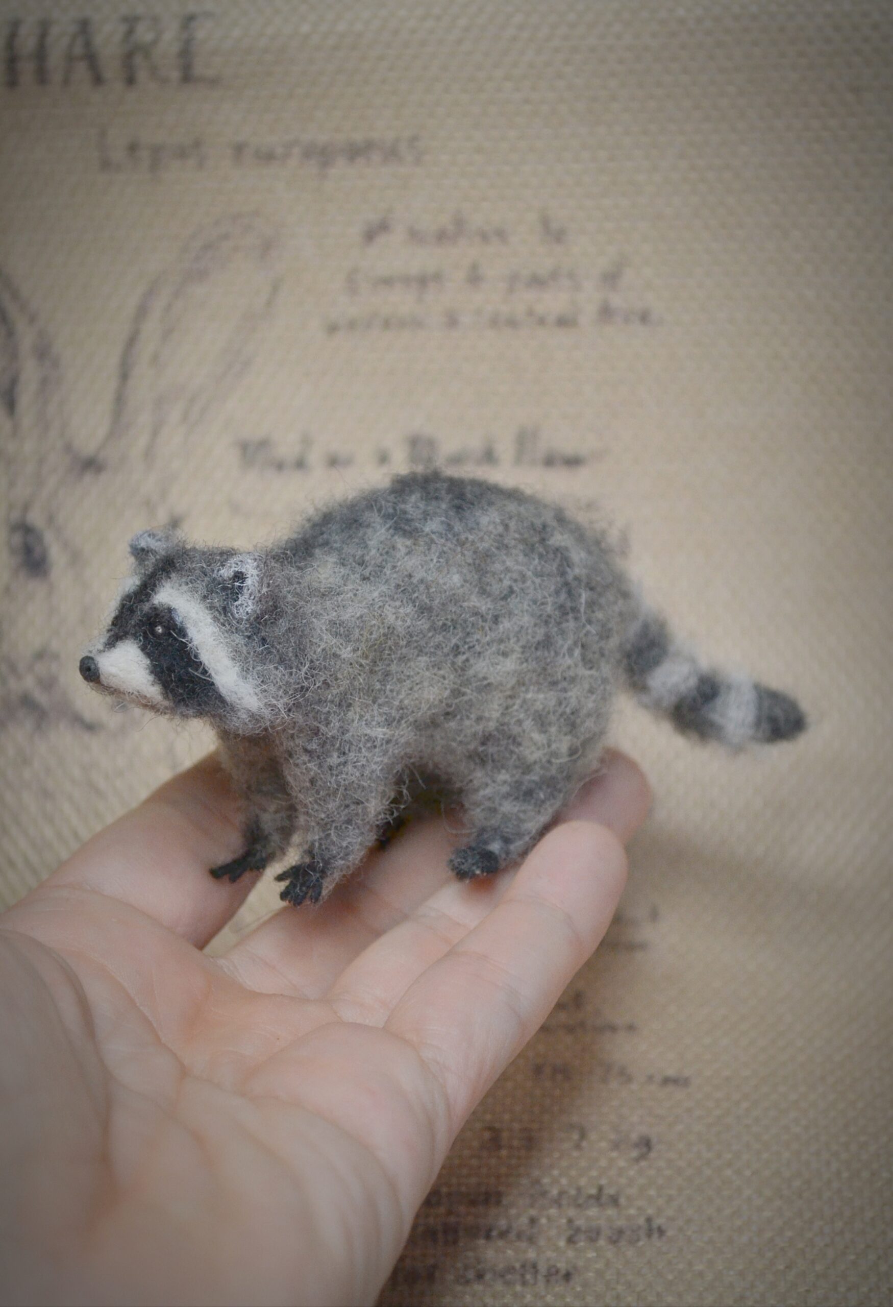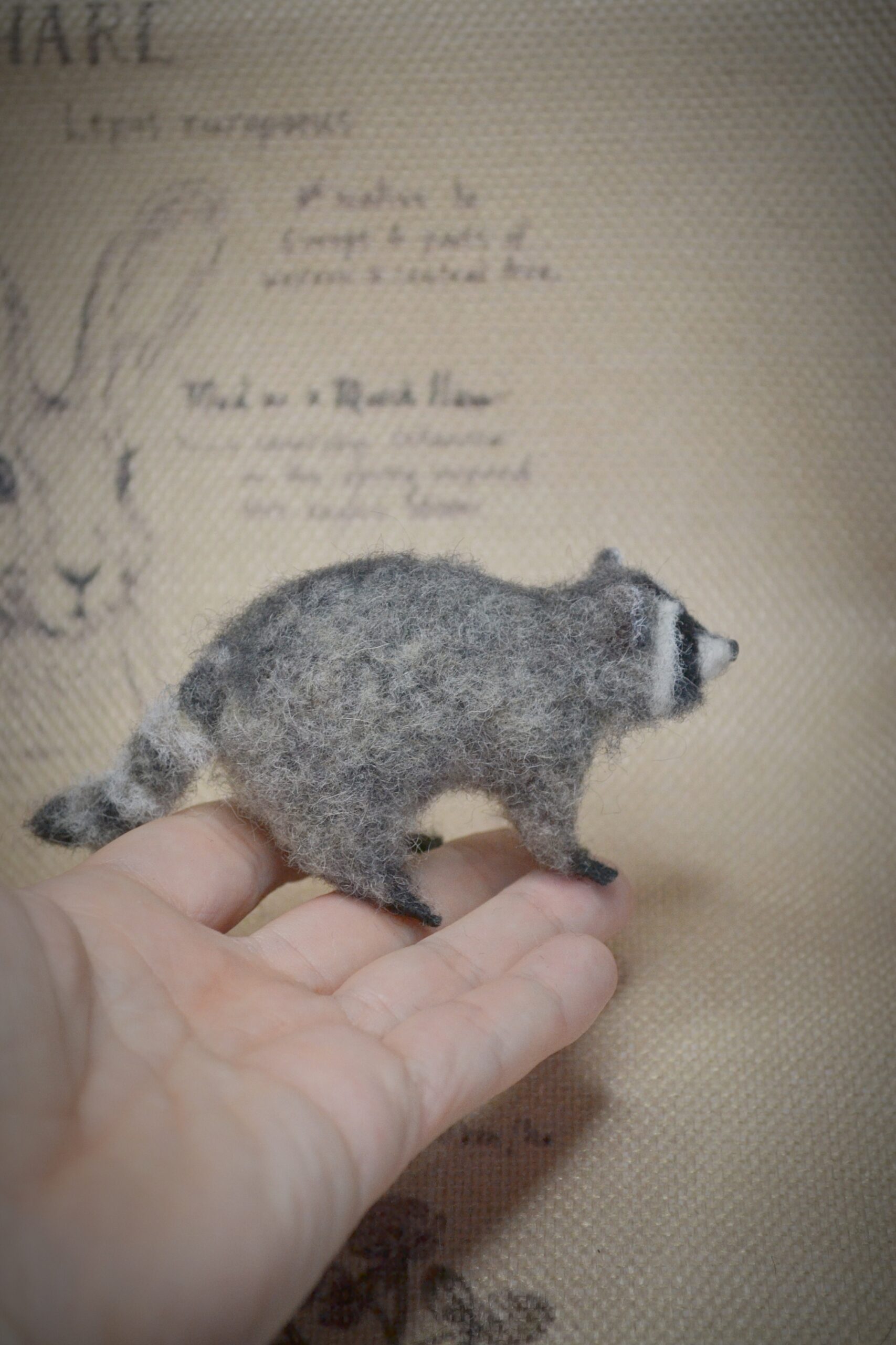 This handmade needle felted raccoon miniature is a charming wool sculpture inspired by the curious and intelligent woodland animal. Carefully crafted from 100% natural wool, this felted raccoon features soft texture, detailed shaping, and the recognizable facial mask that gives raccoons their distinctive look.