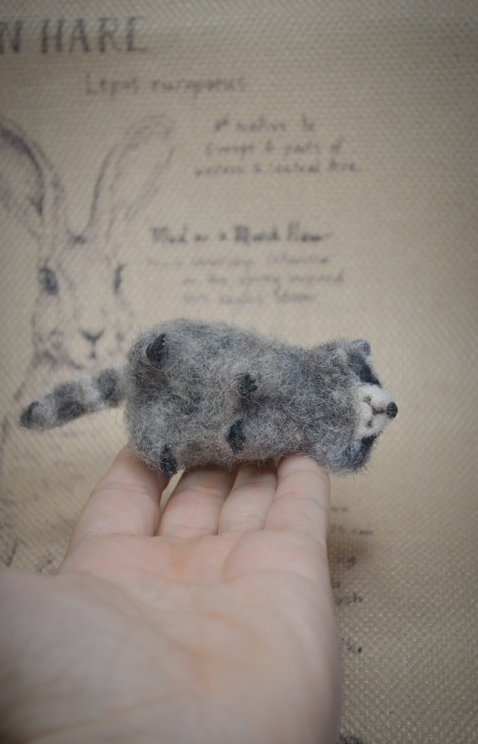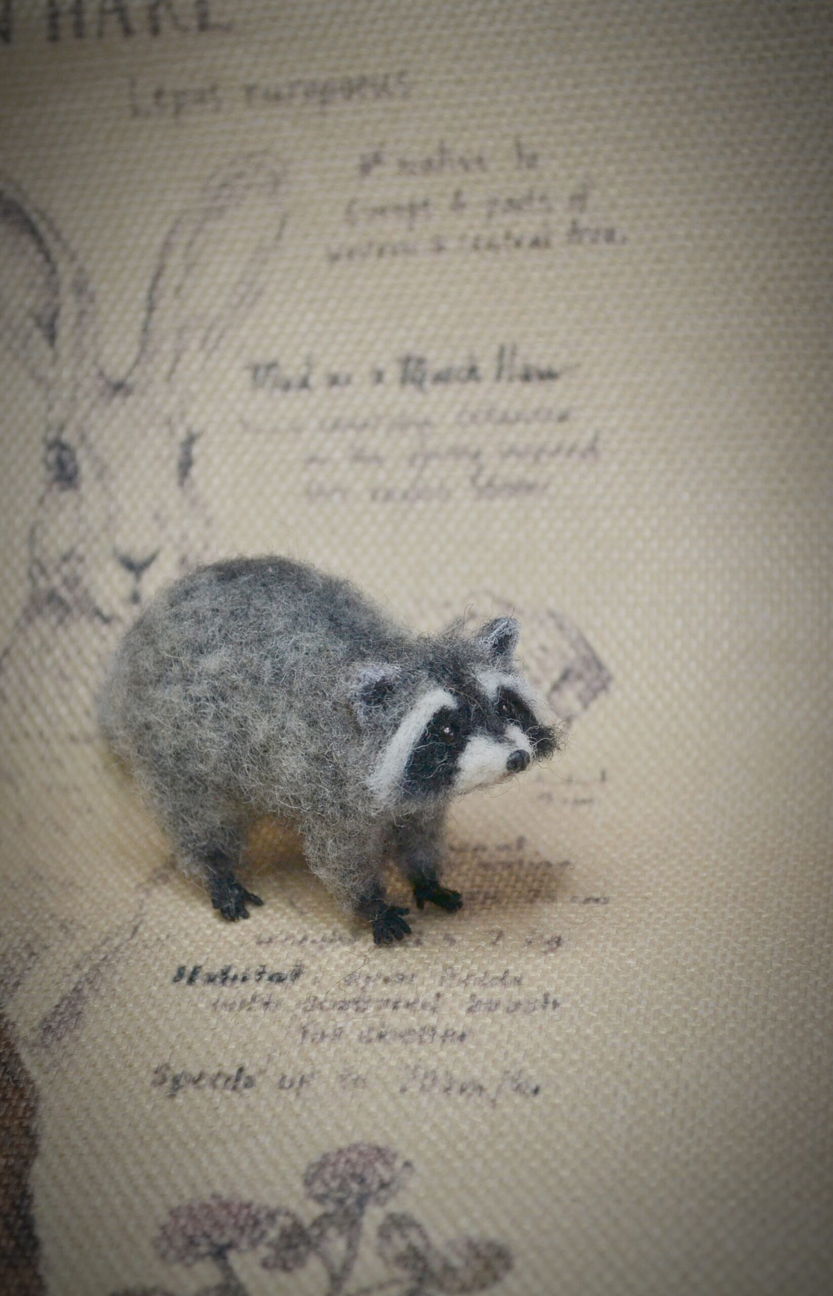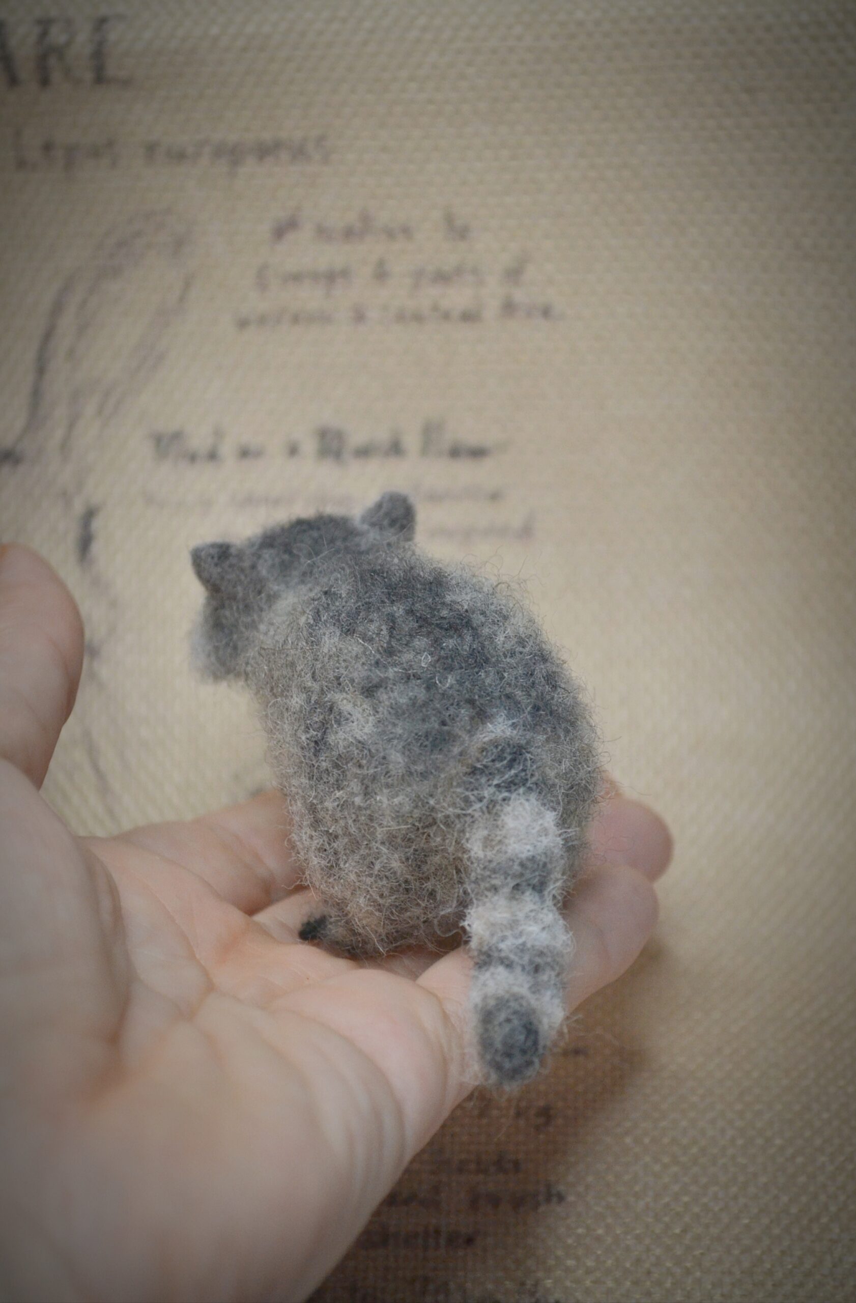 This handmade needle felted raccoon miniature is a charming wool sculpture inspired by the curious and intelligent woodland animal. Carefully crafted from 100% natural wool, this felted raccoon features soft texture, detailed shaping, and the recognizable facial mask that gives raccoons their distinctive look.