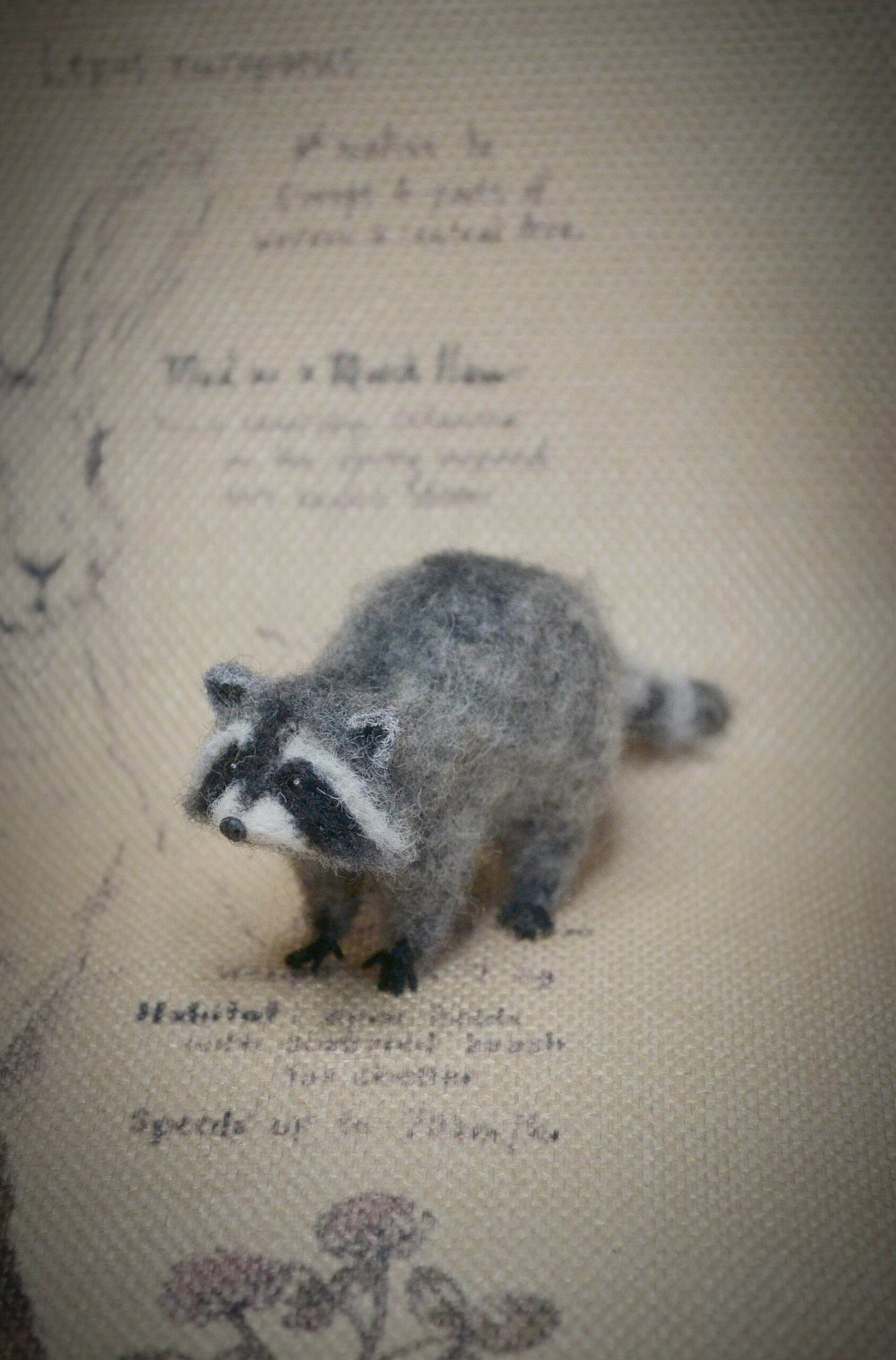 Each felted raccoon miniature is individually shaped using traditional needle felting techniques, ensuring every wool sculpture is one of a kind.