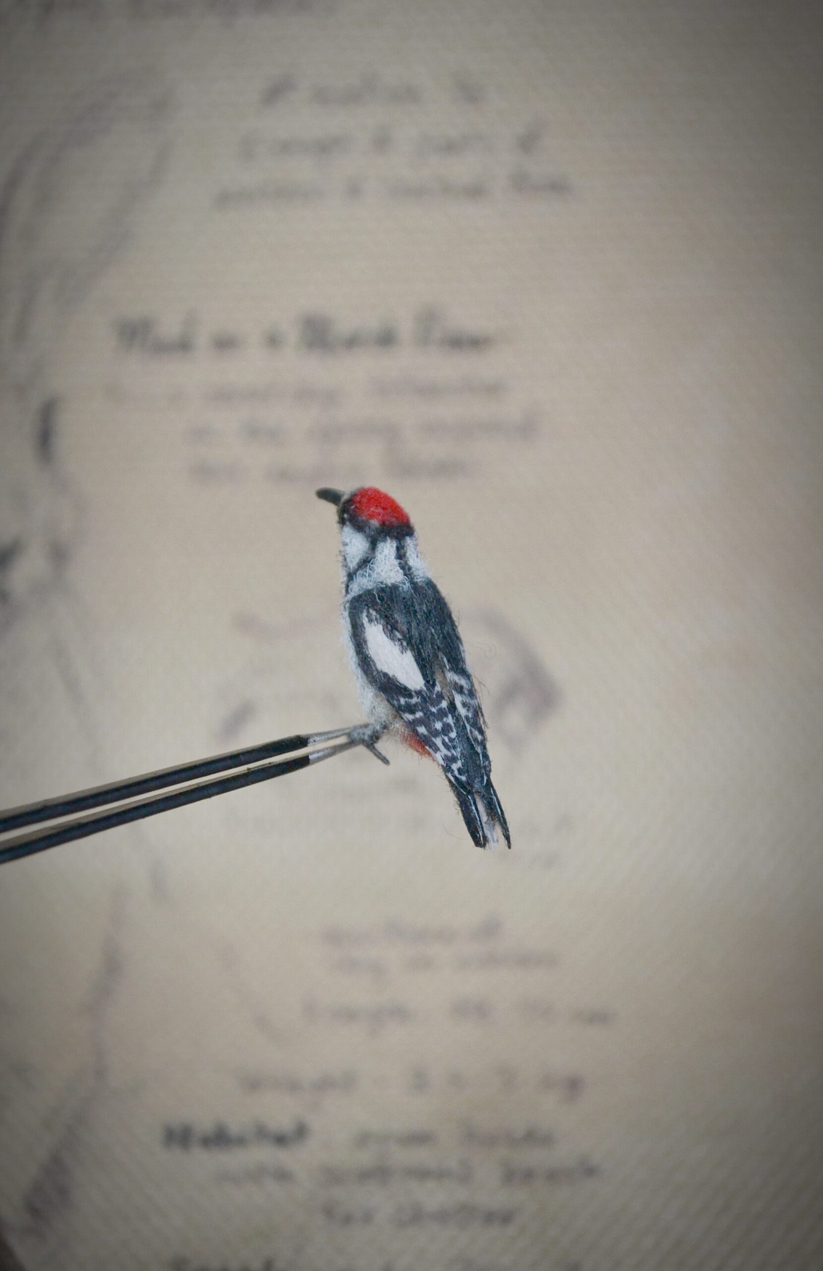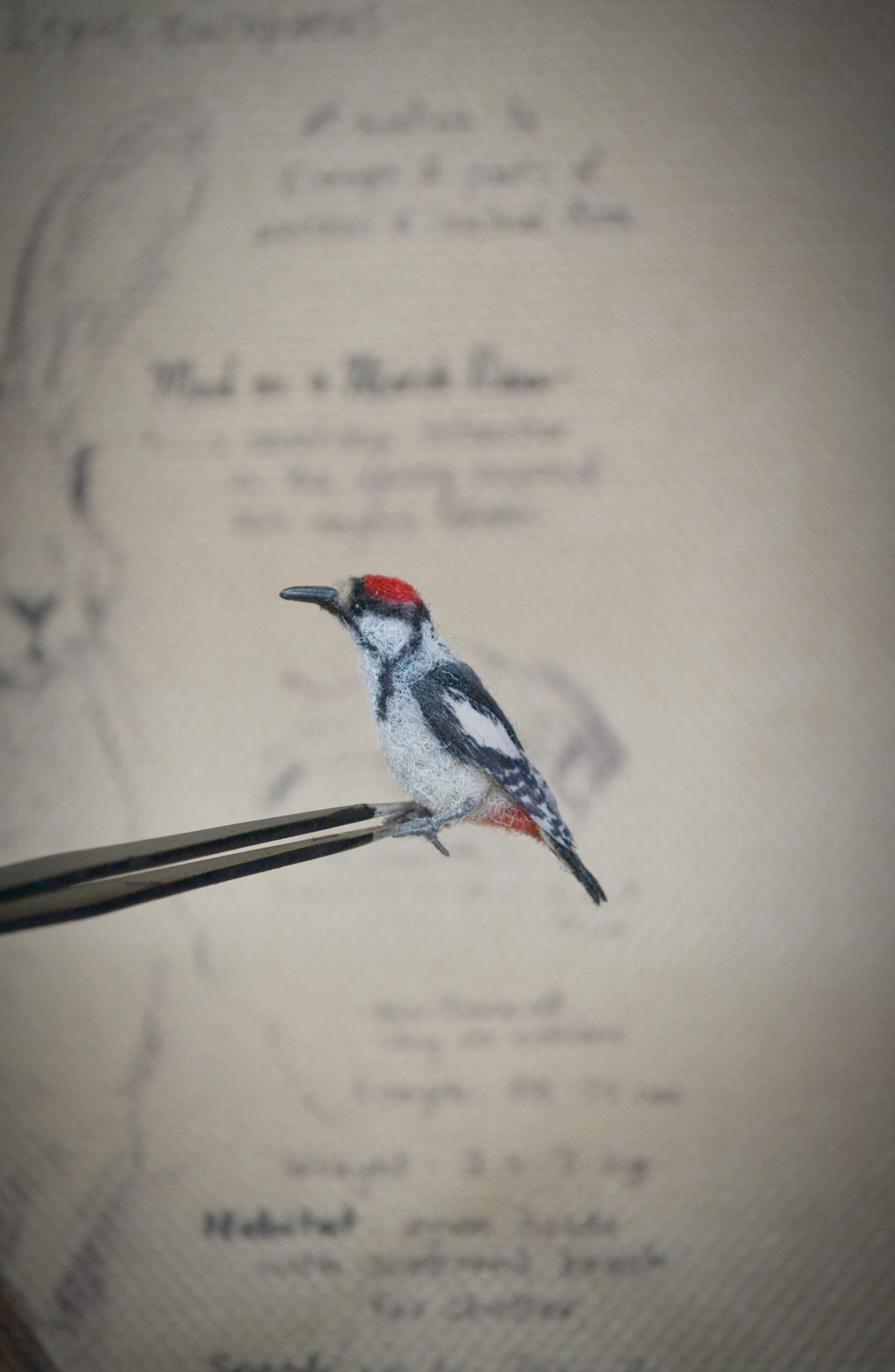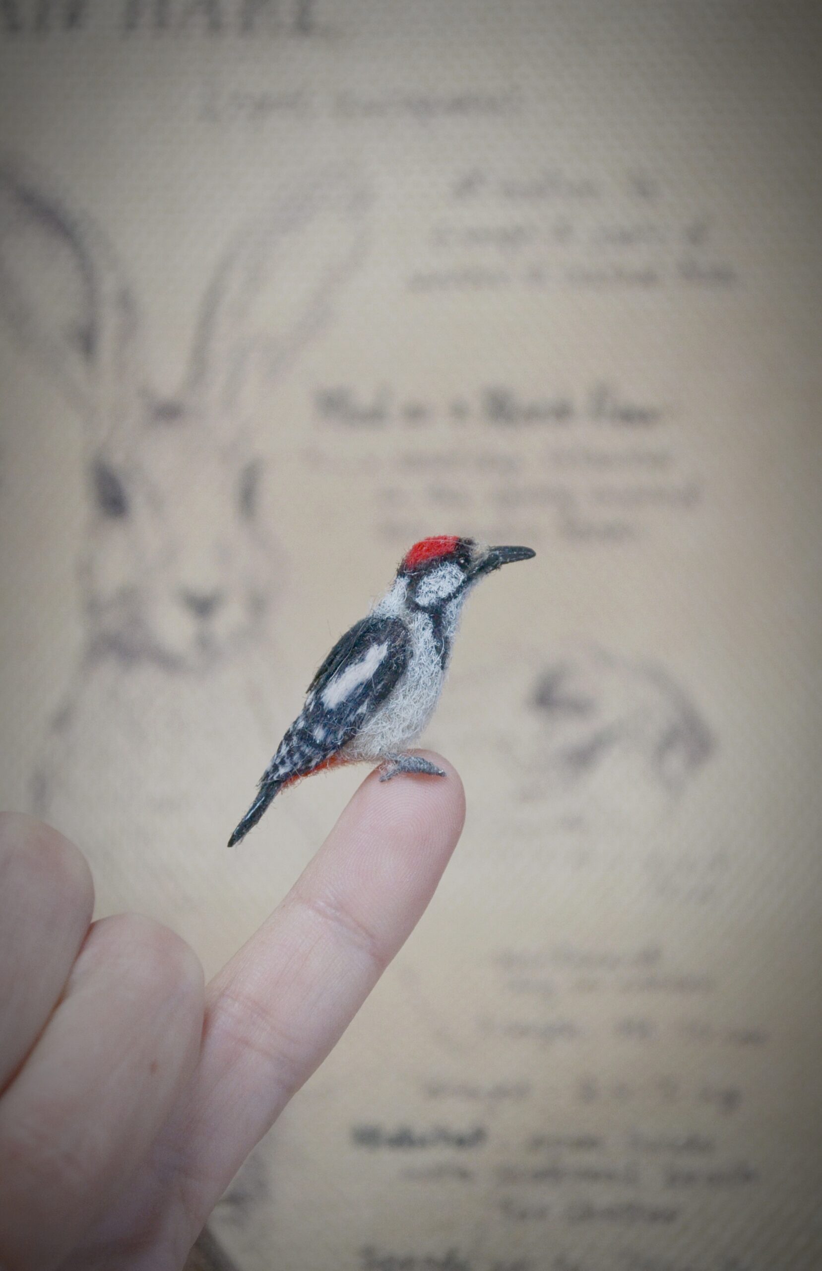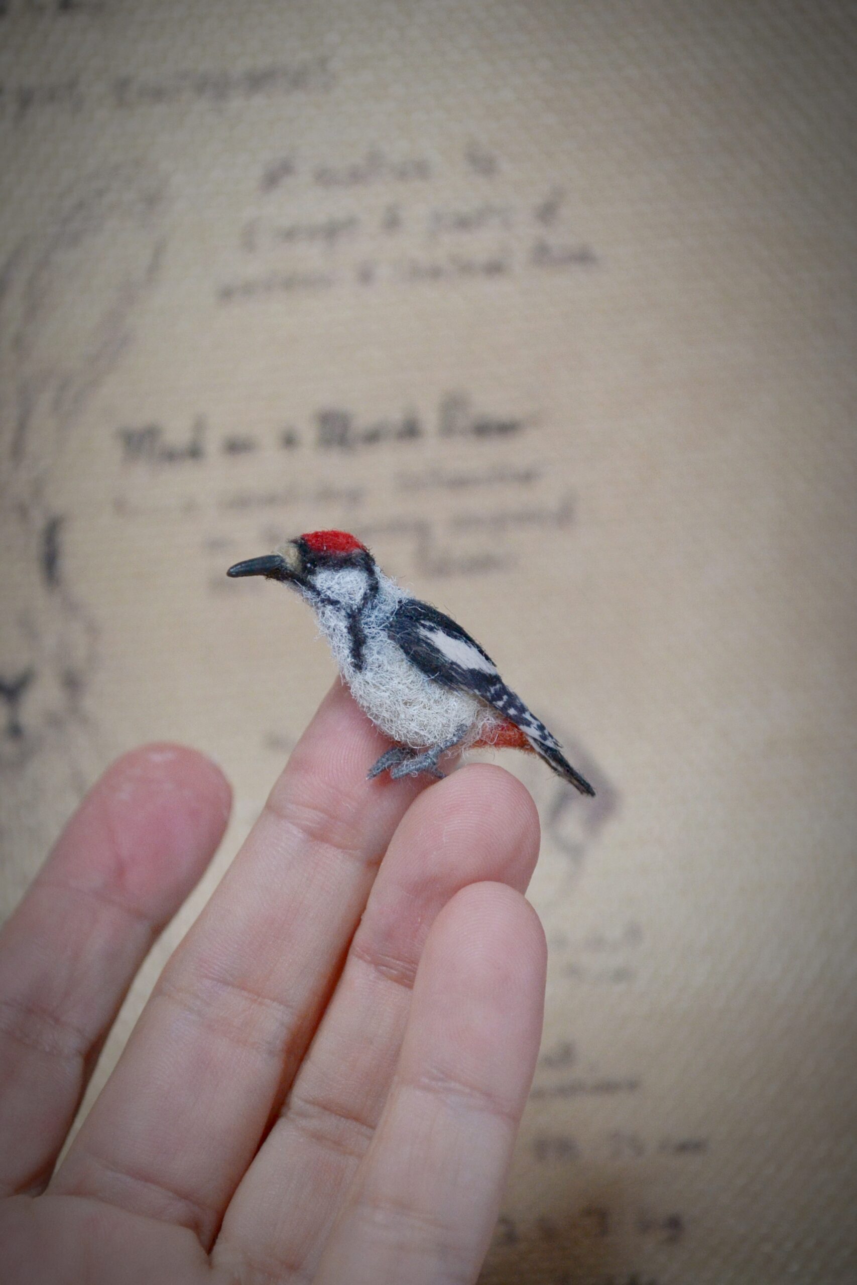 Each felted woodpecker miniature is individually shaped using traditional needle-felting techniques, making every wool bird sculpture unique.