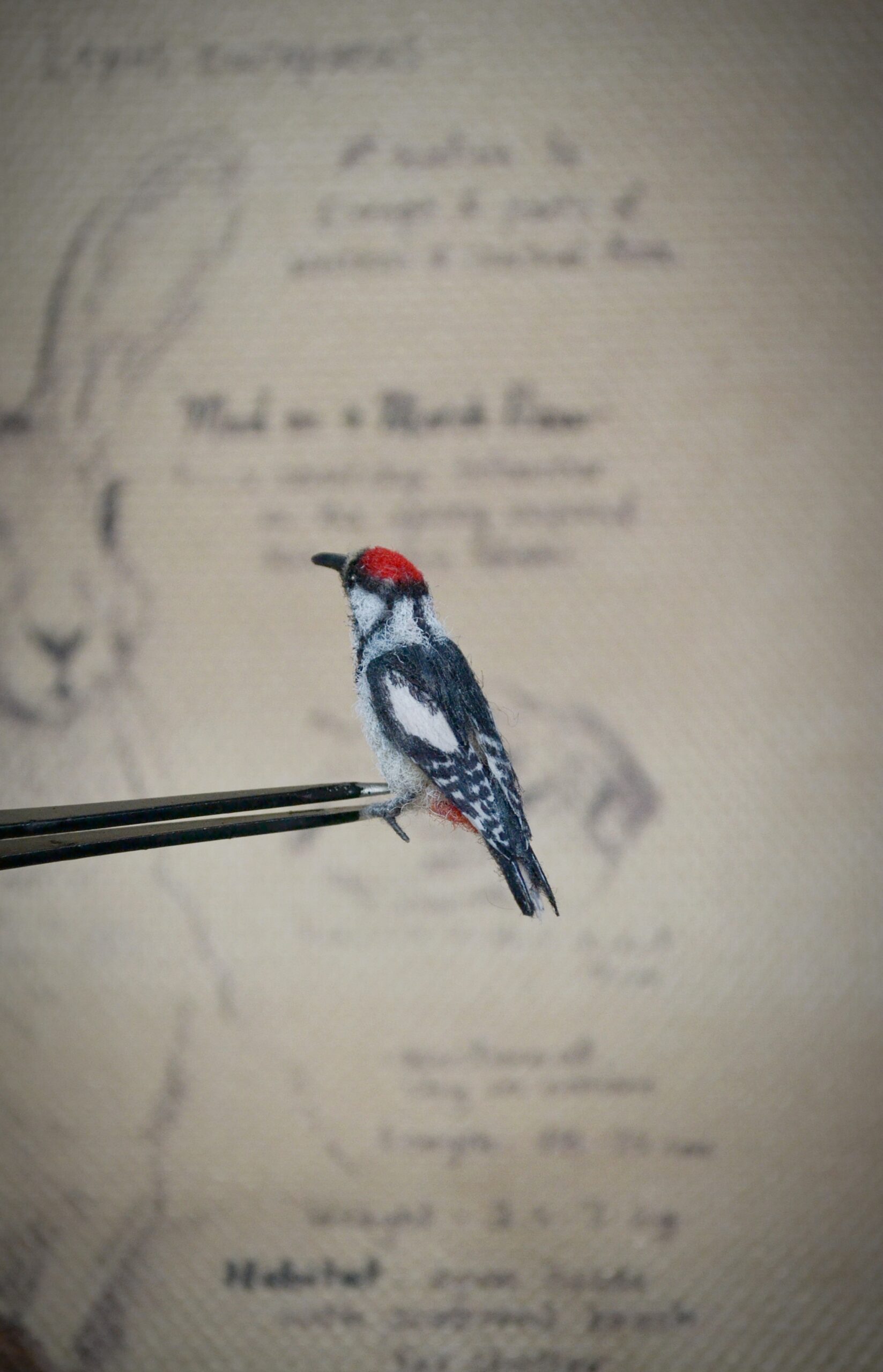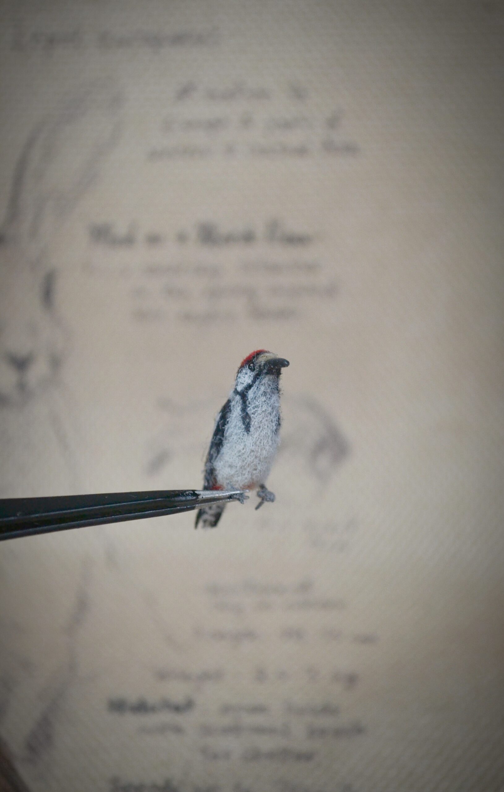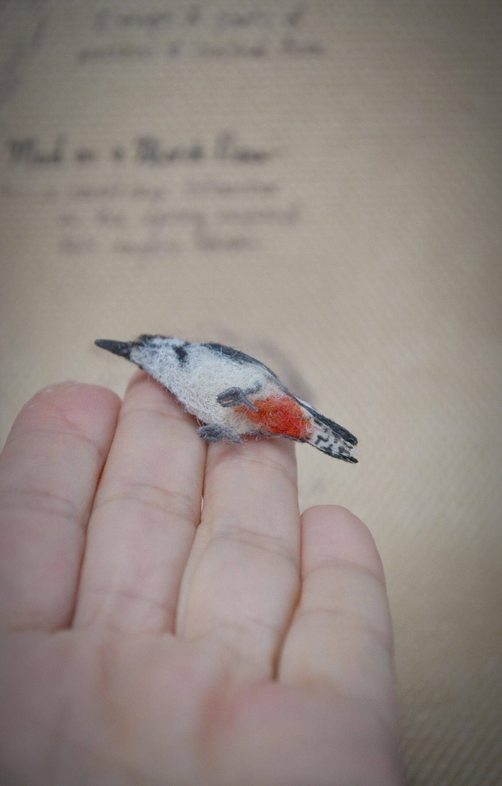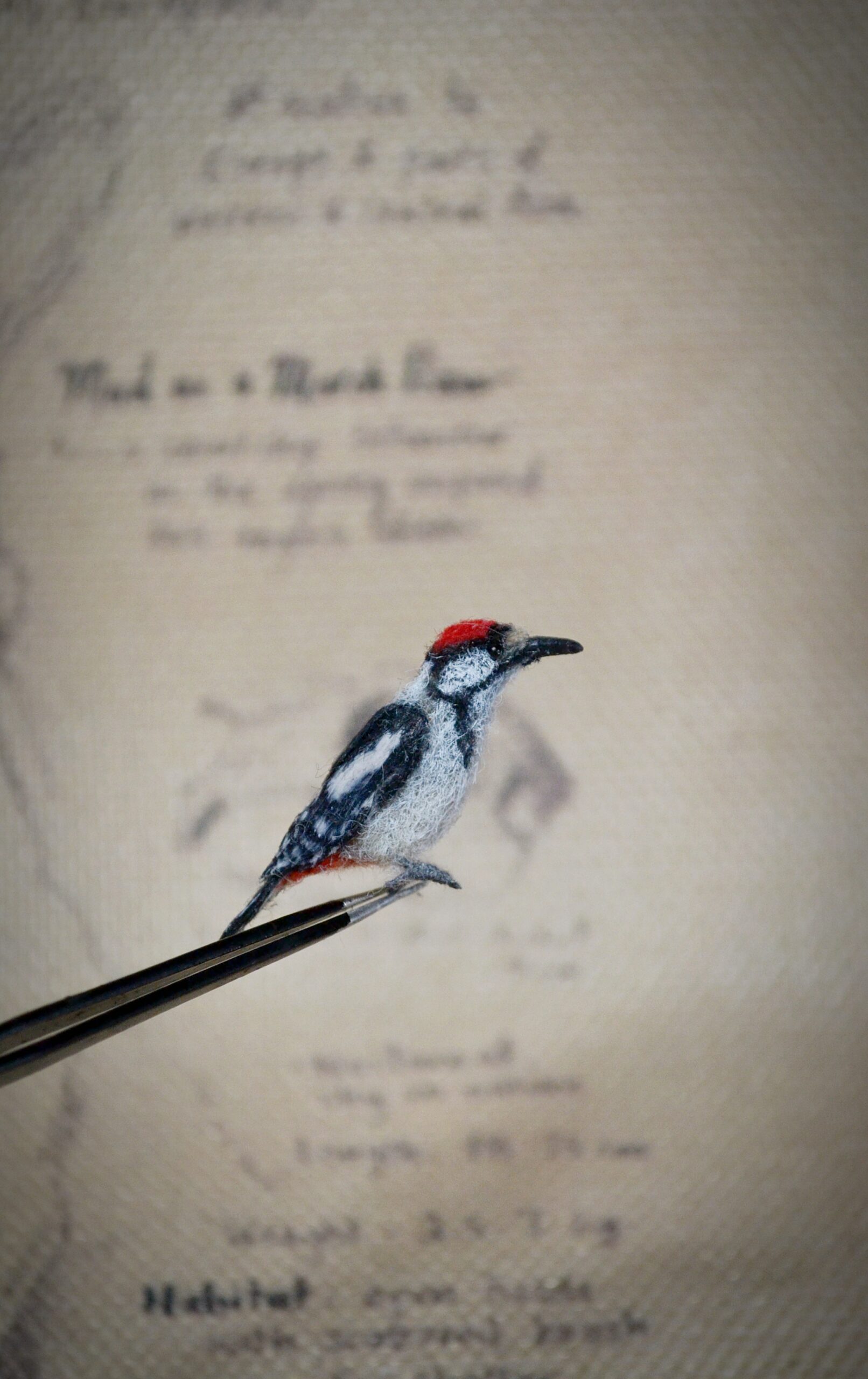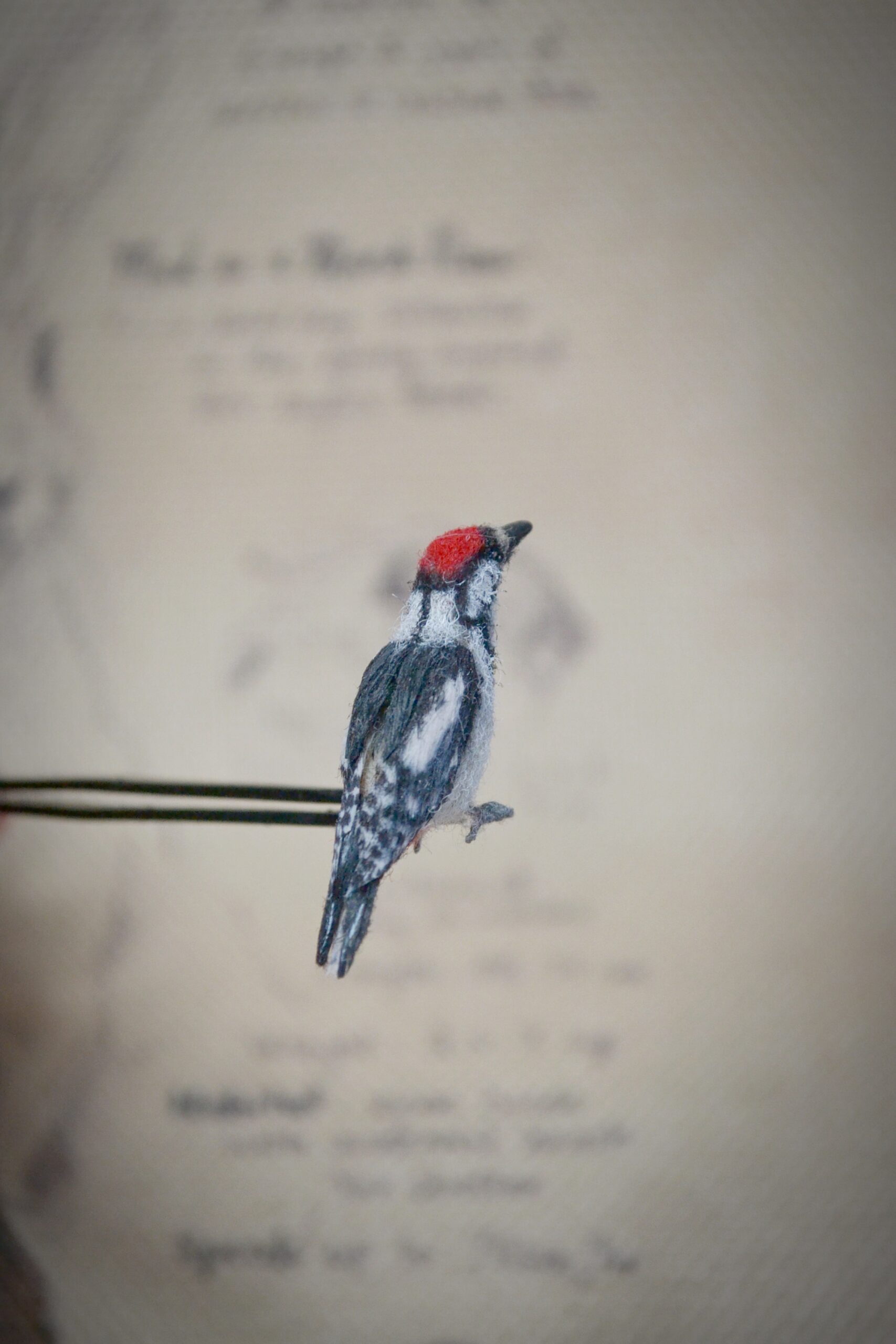 Each felted woodpecker miniature is individually shaped using traditional needle-felting techniques, making every wool bird sculpture unique.
